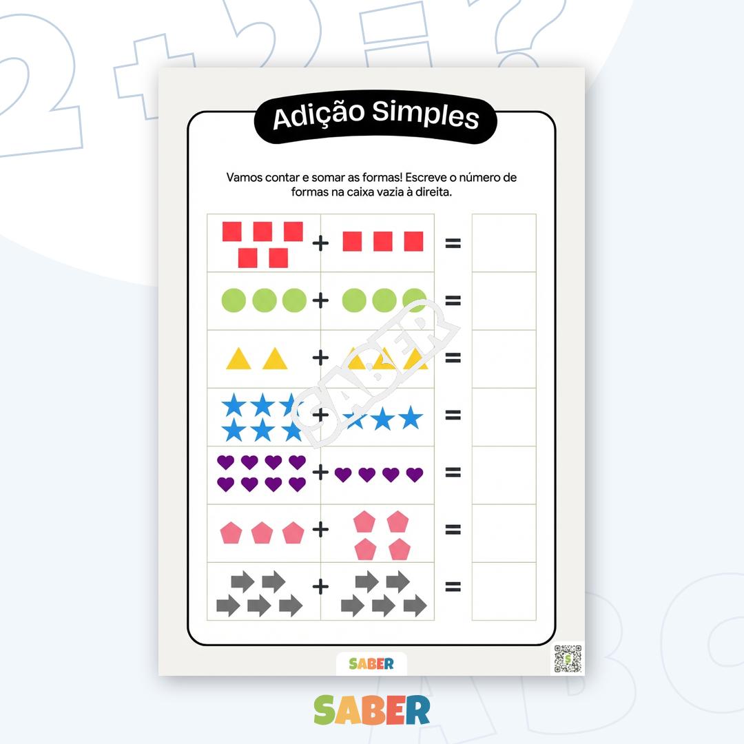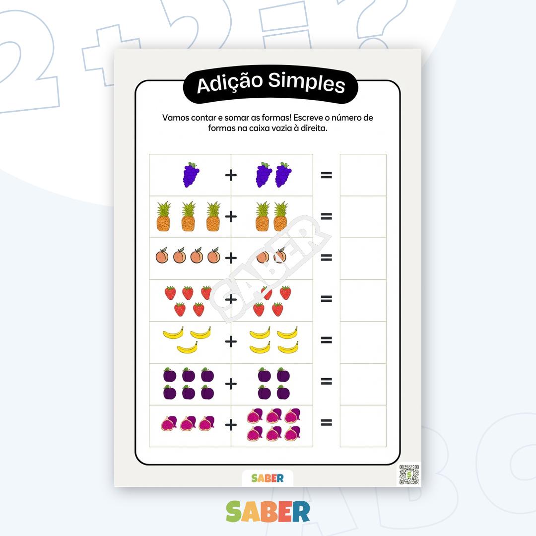 Estas fichas de Adição Simples ajudam as crianças a contar e somar quantidades através de imagens coloridas (formas e frutas), escrevendo o número correto na caixa final. Uma forma prática e motivadora de consolidar as primeiras contas! ➕🍇